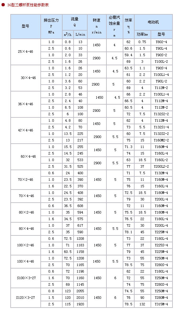 3GR三螺桿泵所輸液體為各種不含固體顆粒,3gr三螺桿泵,3g三螺桿泵無腐蝕性油類及類似油的潤滑性液體,所輸液體粘度為1.2-100E(3.0-760cst),高粘度液體亦可通過加溫降粘后輸送